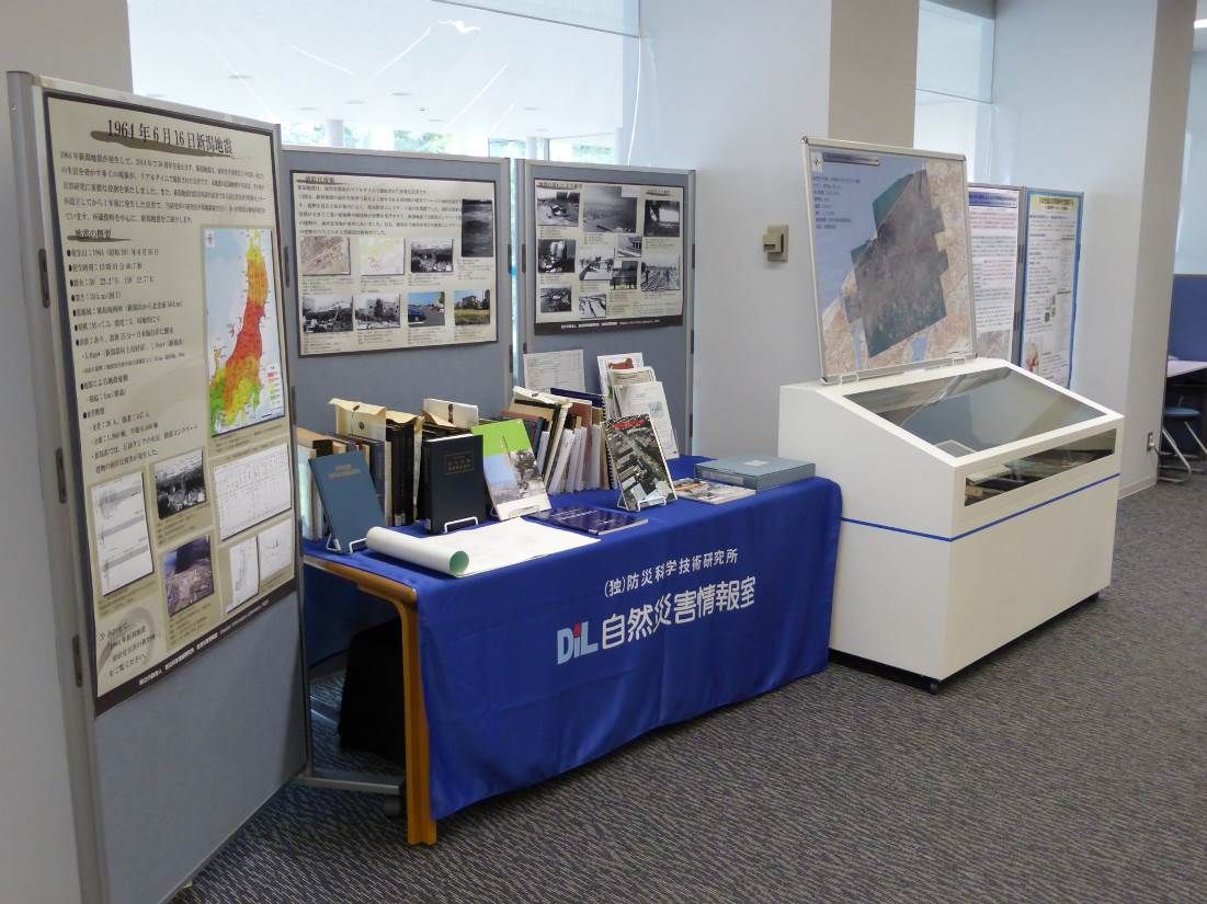 現在、新潟地震に関するミニ企画展を開催しており、当研究所が所蔵する新潟地震に関連する写真、調査報告、論文、書籍などの資料約70点を展示しています。