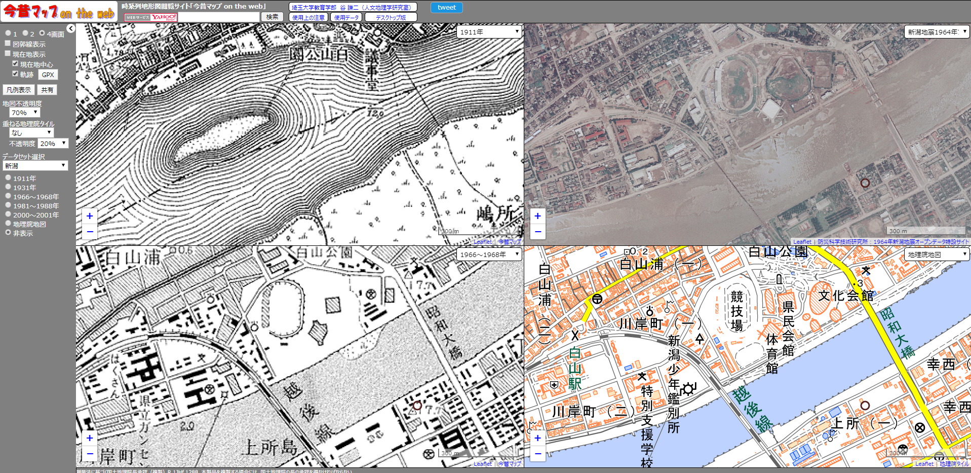 お知らせ印刷2020/04/02 09:00 投稿者:自然災害情報室今昔マップ on the webでご使用いただきました時系列地形図閲覧サイト「今昔マップ on the web」((C)谷 謙二)にて、「広域版新潟市1964年7月21日カラー撮影」タイルをご使用いただきました。 https://ktgis.net/kjmapw/kjmapw.html?lat=37.911464&lng=139.037433&zoom=16&dataset=niigata&age=6&screen=4&scr1tile=kjmap[0]&scr2tile=niigata_eq&scr3tile=kjmap[2]&scr4tile=k_cj4&mapOpacity=7&overGSItile=no&altitudeOpacity=2 お知らせへ戻る