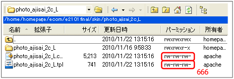 (2) フォルダの中をクリックし、cssファイルとtplファイルのパーミッションを「666」に変更しておきます。