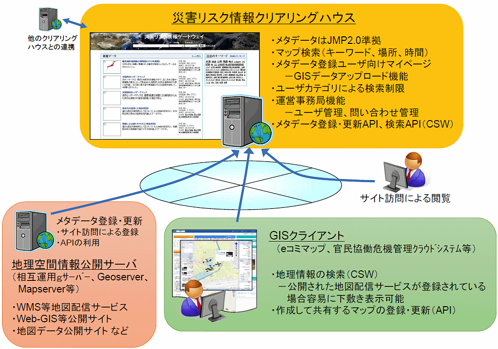 本システムは相互運用gサーバーとAPIによる連携を行っており、相互運用gサーバーで登録した地図のメタデータをクリアリングハウスへ登録が簡単にできます。