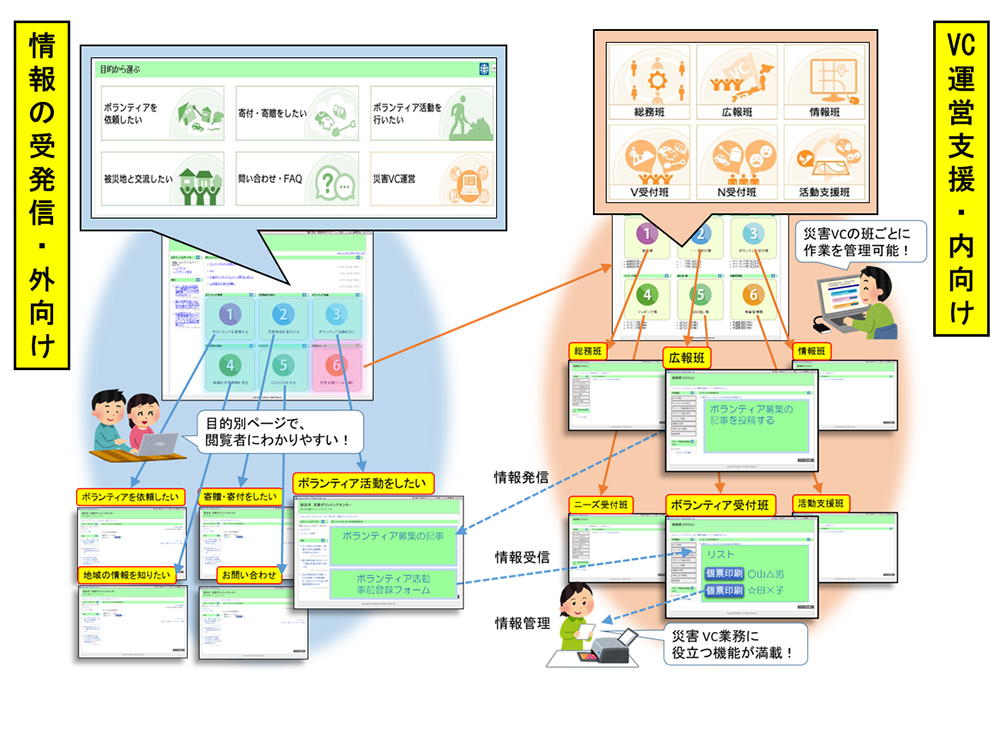 本システムは、「eコミュニティ・プラットフォーム(以下、eコミ)」の高度化の一環として、東日本大震災直から、宮城県災害VC(宮城県社会福祉協議会)及び同県内の市町村災害VCでの「eコミ」の活用実態を踏まえ、災害VCの設置・運営訓練に用いられている全国の都道府県や市町村の災害VC運営マニュアルの収集・分析を通じて、災害対応フェーズに応じて行うべき災害VCの活動と、組織内・外で被災地内外に散在している情報の集約・共有・利活用を支援するために開発しました。