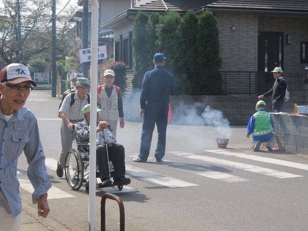 今回の発災対応型訓練としての取り組みは、ご自宅から避難場所(公園)に避難するに際し、避難経路沿いの会場周辺の数か所に火災発生現場、家屋倒壊・負傷者発生現場、要援護者支援の場を設定し、その場に遭遇した市民の皆さんが適切な対応ができるかを訓練し、検証していました。