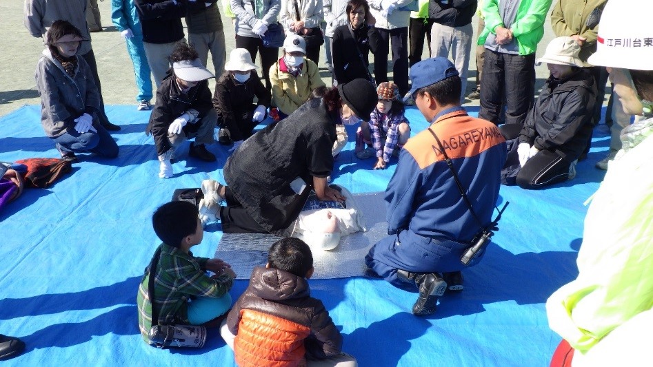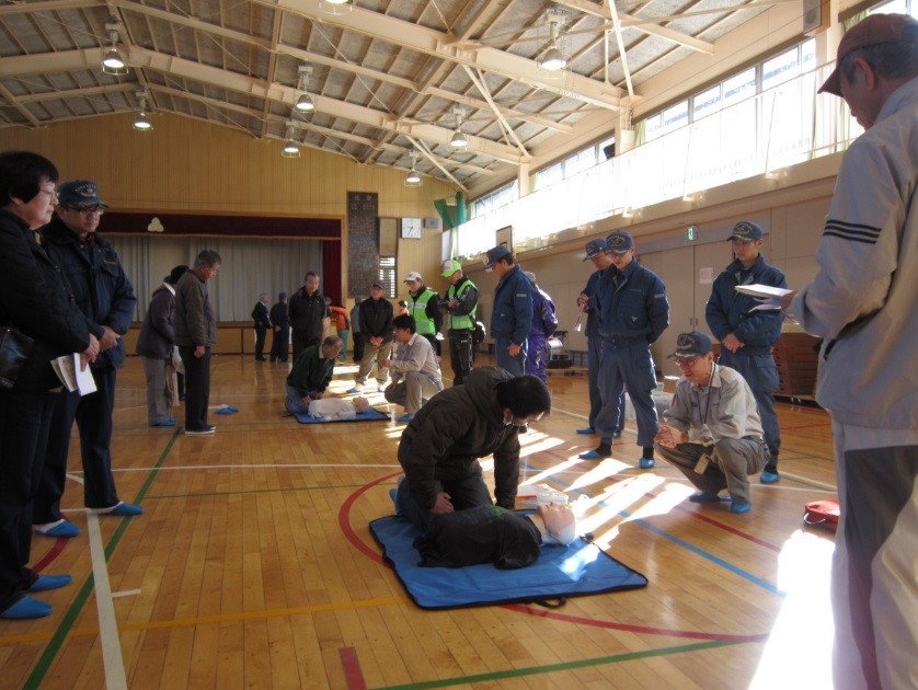 また、北消防署、消防団の方からAEDを使用した応急救護訓練の説明を受け、一部の方が体験しました。