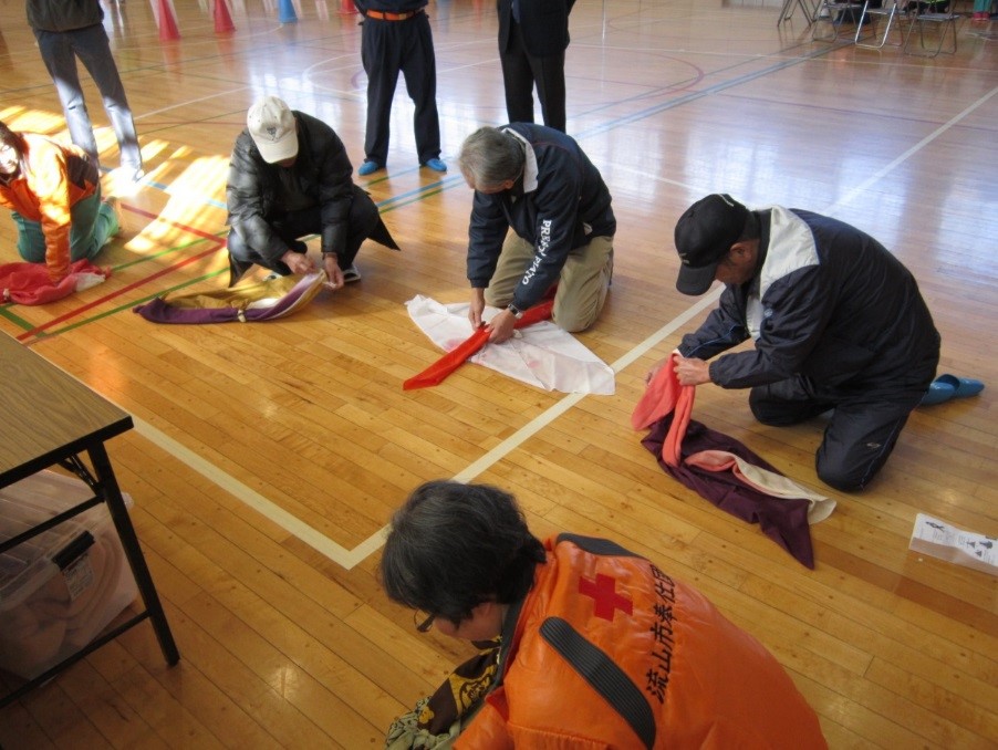 その内容は、応用包帯などによる応急救護処置として、ストッキングを活用した応用包帯の作成や、骨折時、雑誌を活用した応急処置の他、タオルケットや毛布を使用したガウンの作成、風呂敷を使ったリュックサックの作成など、これまでの防災訓練にない、目新しい内容で、皆さんが熱心に取り組んでいました。