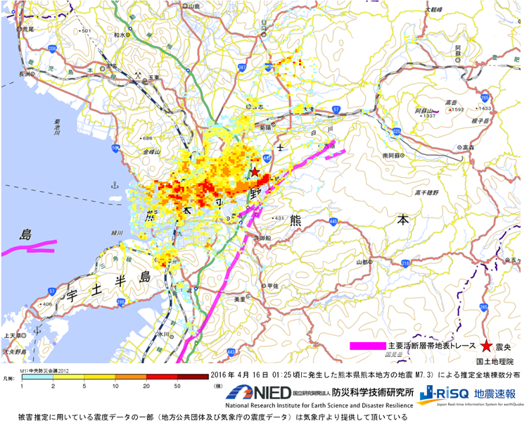 推定全壊棟数分布(2016/4/16 01:25頃に発生した熊本県熊本地方の地震M7.3) 防災科学技術研究所